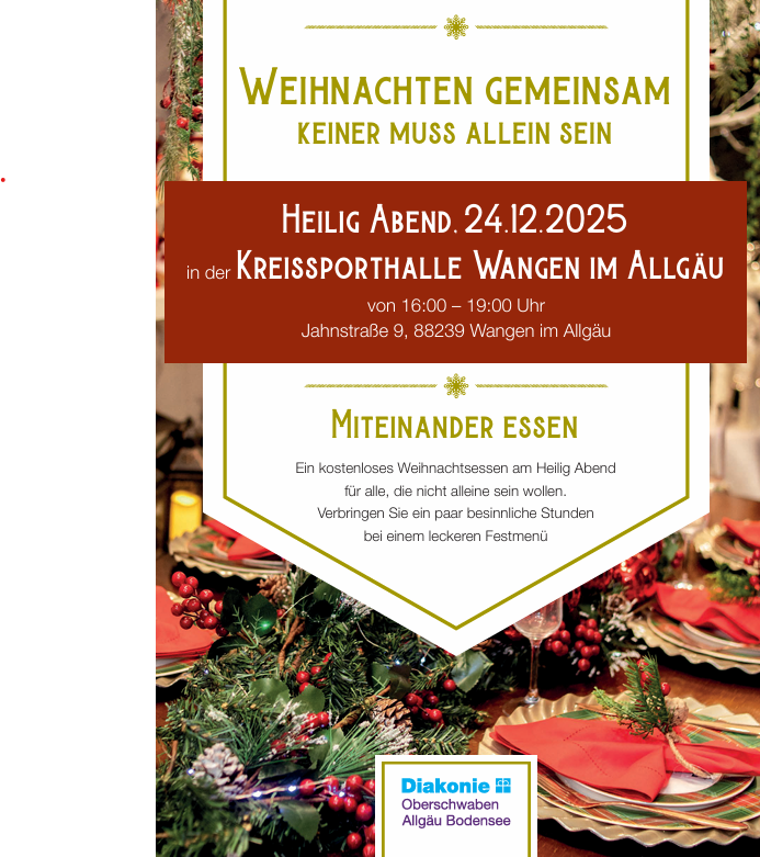 „Weihnachten gemeinsam“ Heilig Abend: 16:00–19:00 Uhr Ort: Foyer der neuen Kreissporthalle, Wangen im Allgäu